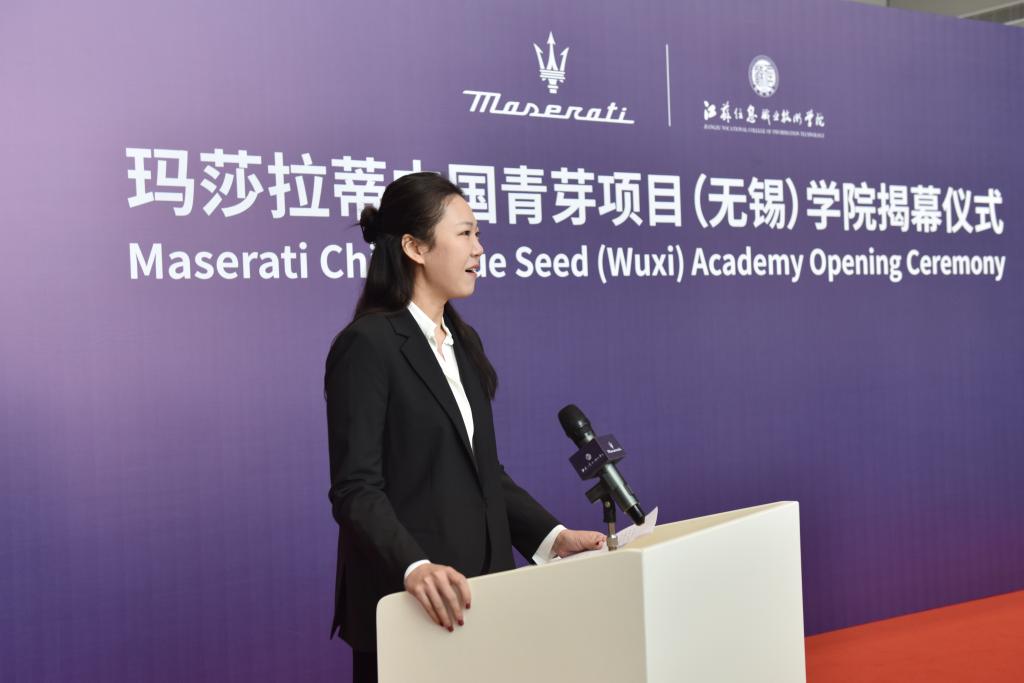 任璟璐女士在致辞中表示,本次玛莎拉蒂中国青芽项目(无锡)学院揭牌迎来双方合作发展新的里程碑。她阐释了“青芽”项目理念和内涵,“青芽”代表着种子和潜力,也代表着玛莎拉蒂对未来人才的期待和重视;她希望在双方共同努力下,不断提升合作水平,为企业持续培养高品质人才。