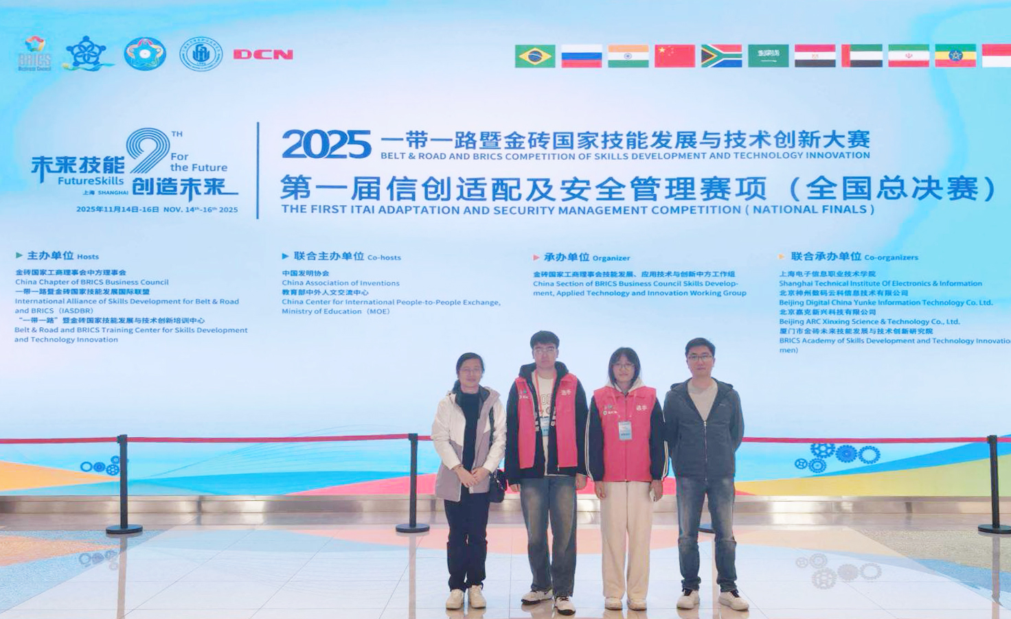 11月14日至16日,2025“一带一路”暨金砖国家技能发展与技术创新大赛第一届信创适配及安全管理赛项全国总决赛在上海电子信息职业技术学院举办。Beat365物联网工程学院(信息安全学院)陆红蕾、王锐老师指导的软件246班顾泽宇、董静默同学组成的参赛团队凭借扎实的专业功底和出色的综合能力,在激烈角逐中脱颖而出,成功斩获一等奖。