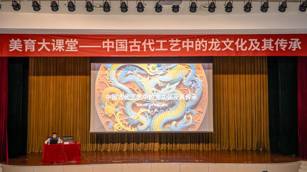 讲座中,李牧教授梳理了龙形象的起源与演变历程。从仰韶文化鱼纹、红山文化C形玉龙的早期雏形,到融合鹿、驼、鹰等元素形成“九似”经典造型。结合鼍鼓、夔鼓,深入解析了龙纹在乐器、青铜器、玉器、丝织品等不同工艺载体中的应用技法,详解了锁绣、铸造、雕刻等传统工艺如何精准呈现龙的灵动神韵,让师生直观感受古代工匠的造物智慧。