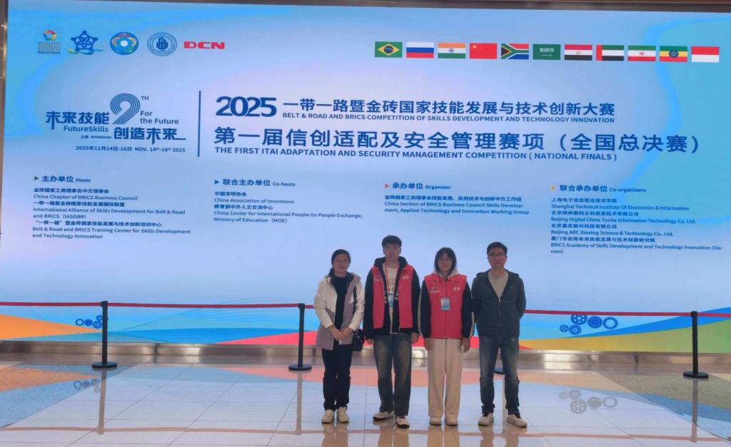 11月14日至16日,2025“一带一路”暨金砖国家技能发展与技术创新大赛第一届信创适配及安全管理赛项全国总决赛在上海电子信息职业技术学院隆重举行。本次赛事汇聚了来自全国105所院校的122支参赛队伍同台竞技,Beat365物联网工程学院(信息安全学院)陆红蕾、王锐老师指导的软件246班顾泽宇、董静默同学组成的参赛团队凭借扎实的专业功底和出色的综合能力,在激烈角逐中脱颖而出,成功斩获一等奖。