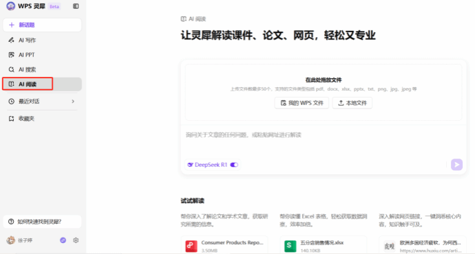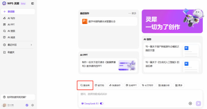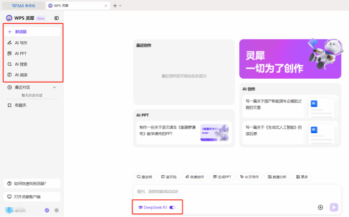 2、打开WPS,点击左侧WPS灵犀,开启DeepSeek开关