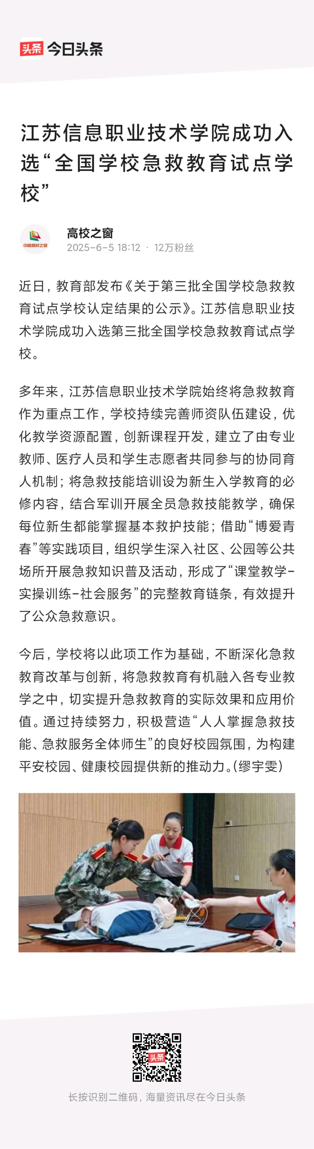 今日头条:Beat365中文官方网站成功入选“全国学校急救教育试点学校”