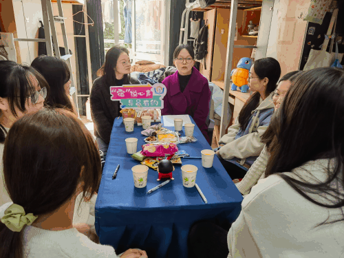 走进宿舍,映入眼帘的是学生用心布置的温馨环境:整洁的书桌、清茶待客、体现宿舍文化的特色装饰……现场没有传统讲台与座次之分,唯有师生环坐的自然与亲切。活动流程精心设计了“见面礼”“主题谈”“心语星愿”“礼物互赠”等环节,在轻松的氛围中引导学生敞开心扉,围绕学业规划、人际交往、职业发展等成长议题畅所欲言。辅导员则以导师与朋友的双重身份,分享经验、解答疑问、传递鼓励。