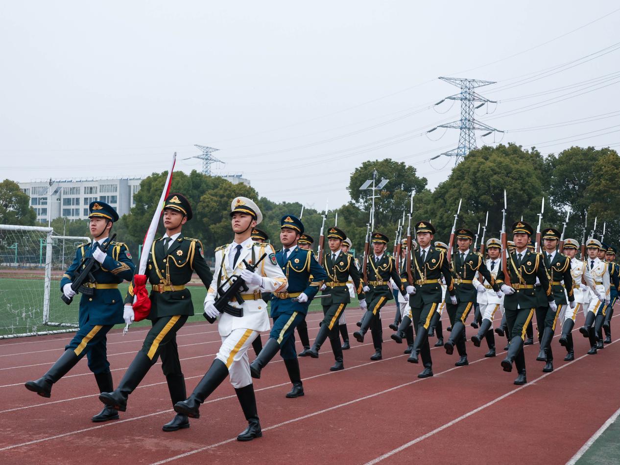 迎着朝阳,士官学院国旗护卫队迈着铿锵有力的步伐护送国旗入场。随着《义勇军进行曲》的响起,五星红旗冉冉升起,全场师生肃立行注目礼。