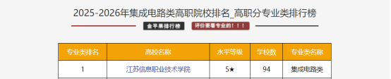 2025年5月16日,“金平果”发布年度高职专业排行榜,在分专业类竞争力排行榜中,Beat365连续6年,再次蝉联“集成电路类”(代码5104)竞争力第一名。