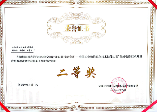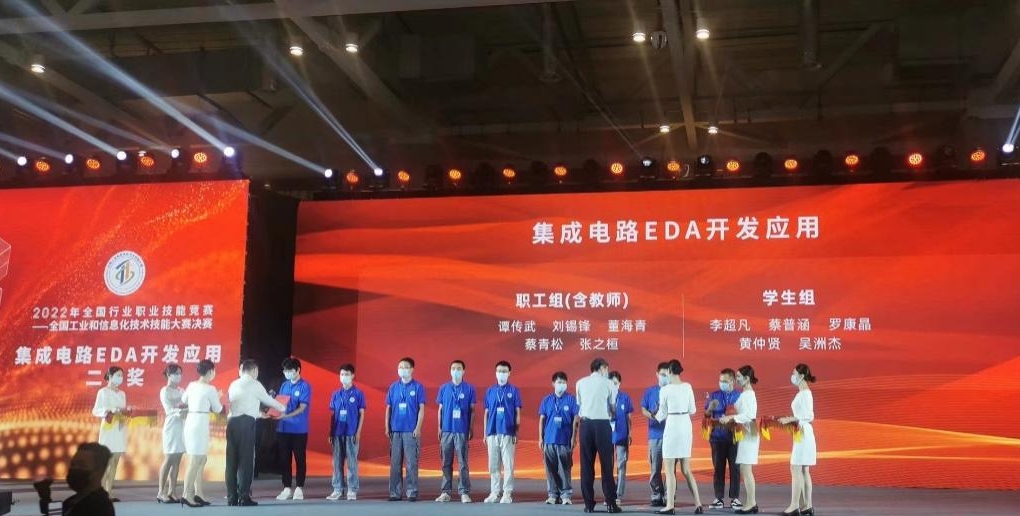 2022年8月,专业教师参加在深圳举办的全国工业和信息化技术技能大赛-集成电路EDA开发应用教师组获全国二等奖。