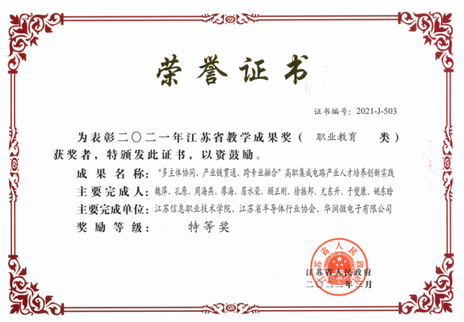 2020年专业授课教师获江苏省教学能力大赛三等奖1项,获江苏省微课比赛三等奖1项。2023年再接再厉,又获国家教学成果二等奖1项。