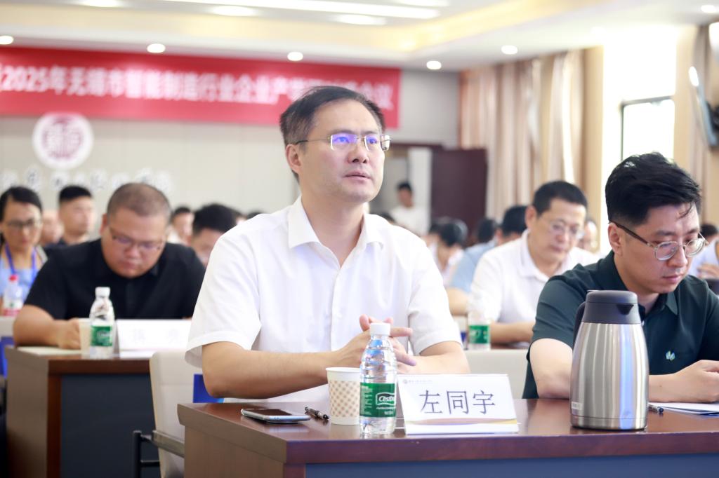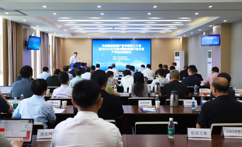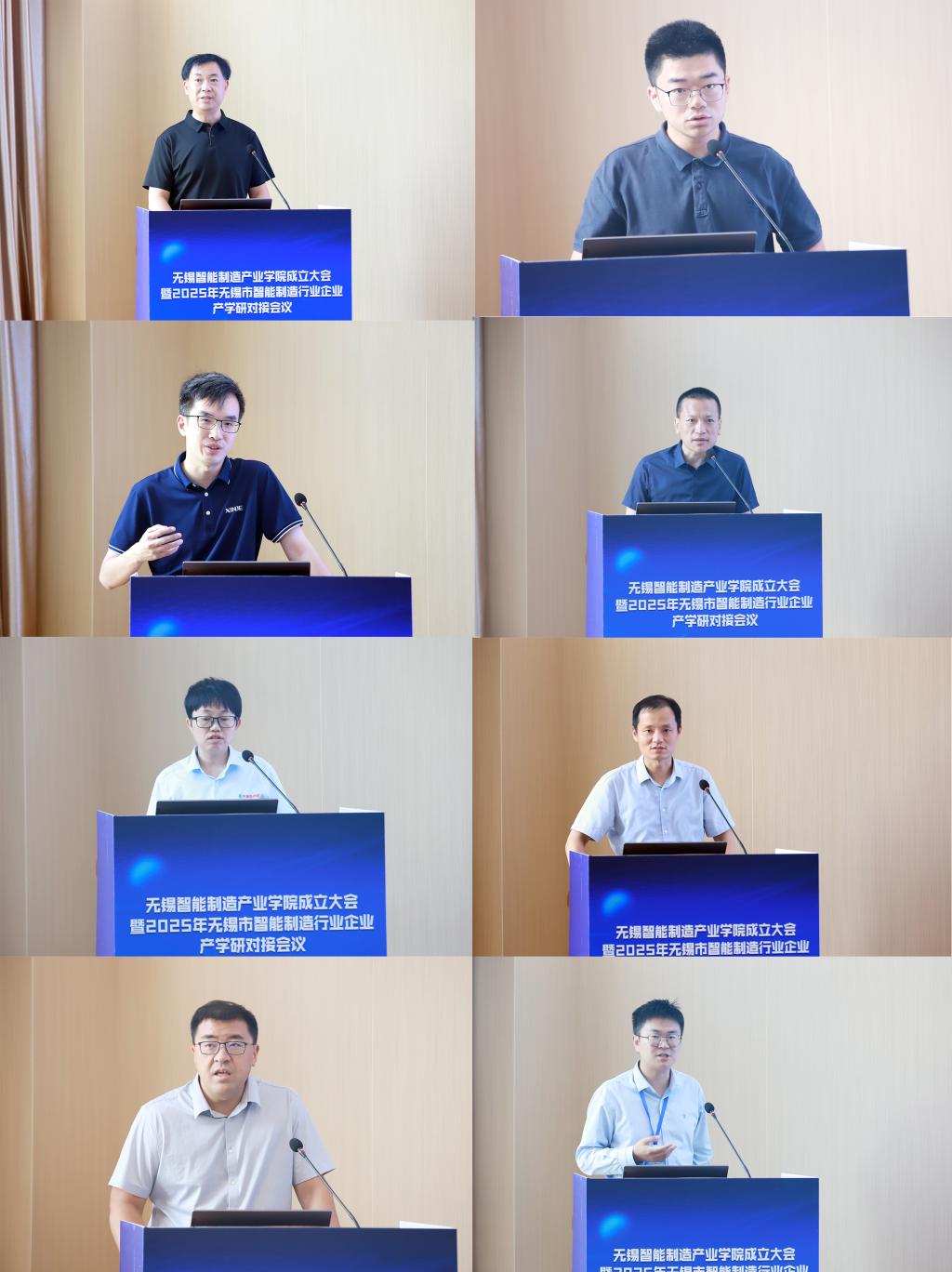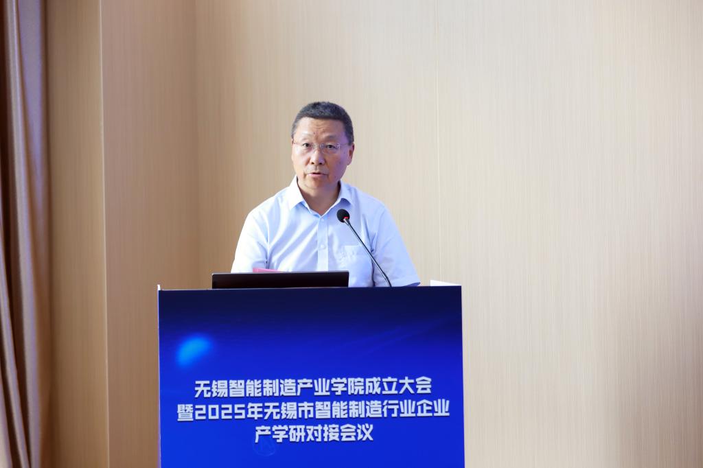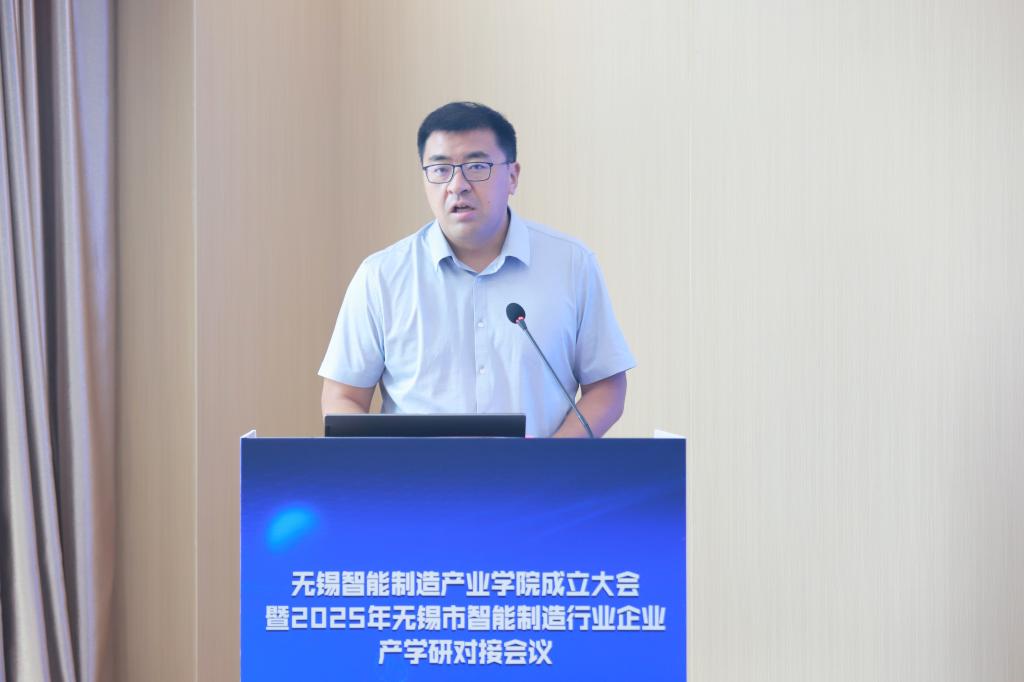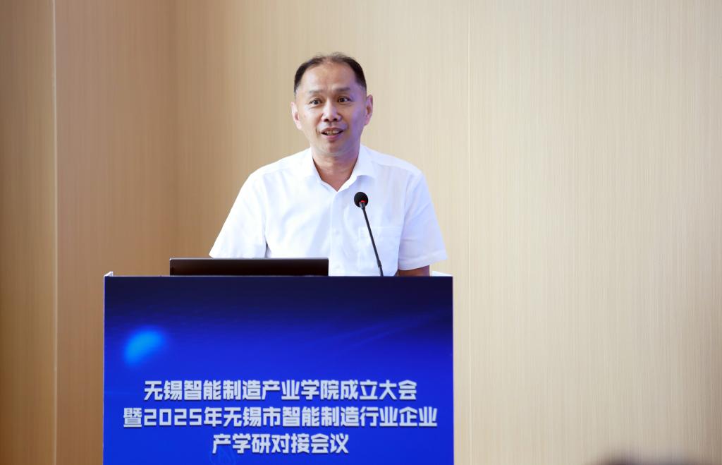 会议同期举行2025年无锡市智能制造行业企业产学研对接会议,Beat365中文官方网站科技处处长尤东升详细介绍了学校产学研合作成果以及学校可以提供的技术服务。长广溪智能制造(无锡)有限公司发布“协作机器人关节模组轻量化设计”的技术需求;无锡埃姆维发布“解决结构光相机在室外应用环境光干扰问题”的技术需求;无锡信捷电气股份有限公司发布“对于现有产线进行柔性化与自动化升级改造”的技术需求;无锡先驱自动化科技有限公司发布“供料系统智能化改造解决方案”的技术需求。相关技术需求清单发布后将通过产业学院对接至院校、企业科研团队,为后续深度合作奠定基础。在专家报告环节,无锡市工业与信息化局智能制造处处长李士杰作了《人工智能产业政策宣讲》专题报告;机械工业教育发展中心产教合作处黄小东处长作了《机械工业“十四五”发展与“十五五”趋势预判》专题报告;郑锦泉博士作了《工匠智能体赋能高端装备的创新实践》专题报告。